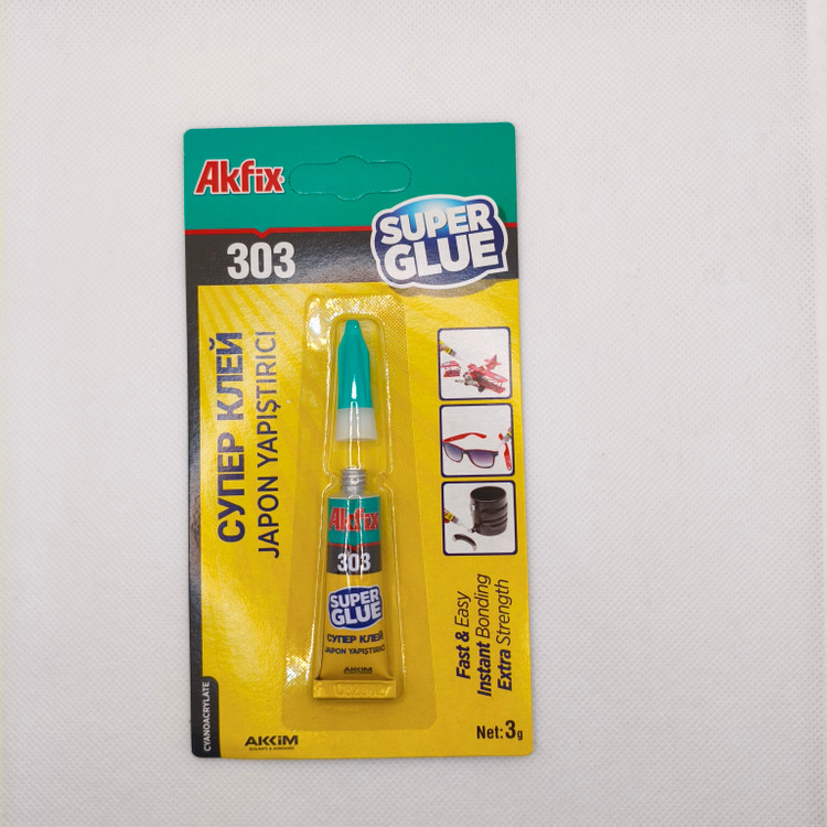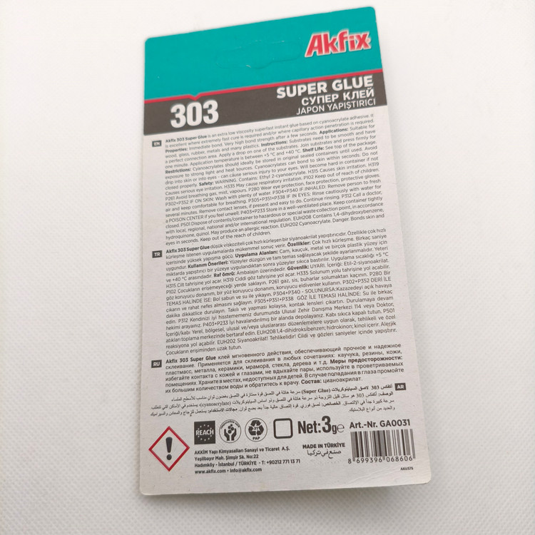 چسب قطرهای آکفیکس AKFIX 303 چسب قطرهای آکفیکس ۳۰۳ مرغوب به صورت ژل مایع و شفاف رنگ است در درمای ۵+ تا ۳۵+ درجه سانتی گراد به نهایت عملکرد خود می رسد قابلیت اتصال فوری اجسام بدون نیاز به حلال استقامت در برابر انواع حلال از قبیل: مواد روغنی، الکلی و بنزین مقاومت نسبت به دماهای بالا و رطوبت محیط