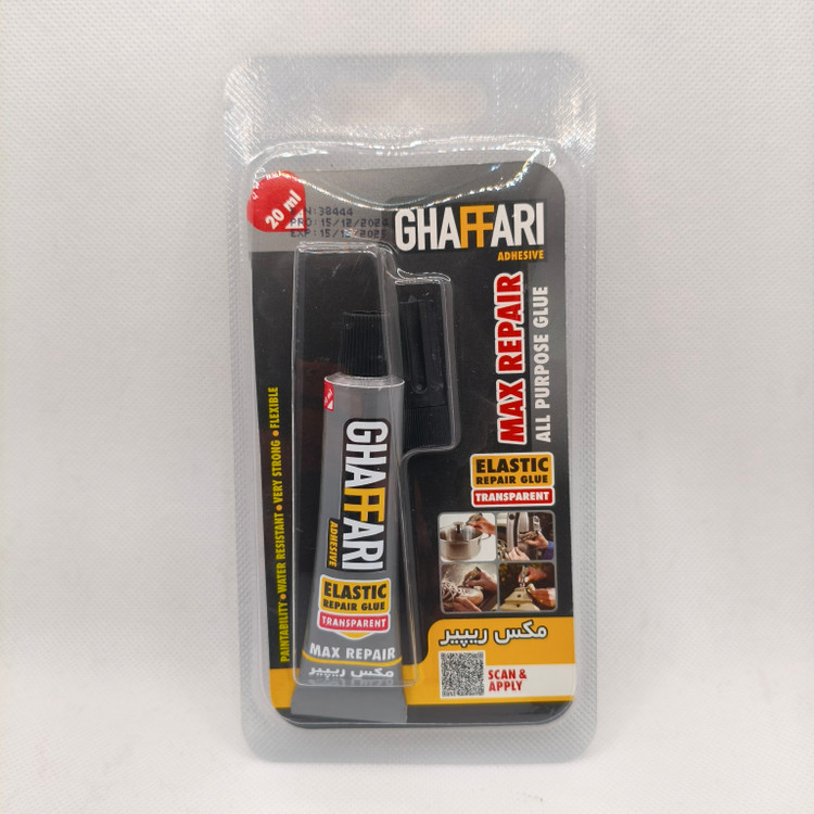 چسب تعمیراتی غفاری با عنوان MAX REPAIR چسبی قدرتمند برای اتصال سطوح غیر همجنس از جمله شیشه، سنگ و سرامیک، سطوح سیمانی و گچی، فلزات، مسنوجات، چوب، چرم، قطعات الکترونیکی، پلاستیک های( به جز مواد بر پایه PE و PTFE) است. این محصول جهت استفاده در شرایط سخت محیطی تا دمای منفی 30 درجه سانتی گراد الی 100 درجه سانتی گراد است.